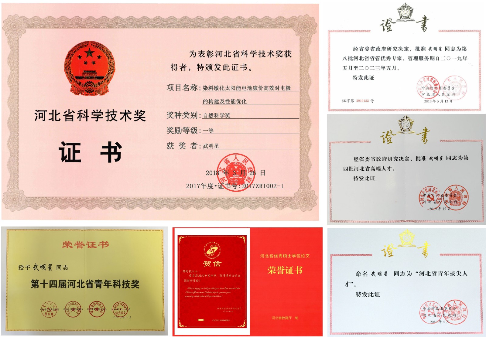 紧密围绕我国新能源、新材料、环保节能等领域的重大战略需求,先进能源材料与器件团队以能源转换与储能材料及器件的理论设计、制备合成为研究方向,主要开展高性能薄膜太阳能电池、电催化、二次电池、燃料电池等方面的研究工作,研究领域涉及材料、化学、物理、电子等众多学科,特别是对电极材料的形成机理、材料的精细调控以及能源器件的性能优化进行了深入研究,逐渐形成了从电极材料的理论设计、化学合成到器件制备的系统研究体系。在新型薄膜太阳能电池领域,提出制备廉价高效电极材料的新思路,揭示了电极/电解质的匹配性机理,研究成果居于国际领先地位,其中《染料敏化太阳能电池廉价高效对电极的构建及性能优化》获河北省自然科学一等奖(图2)。