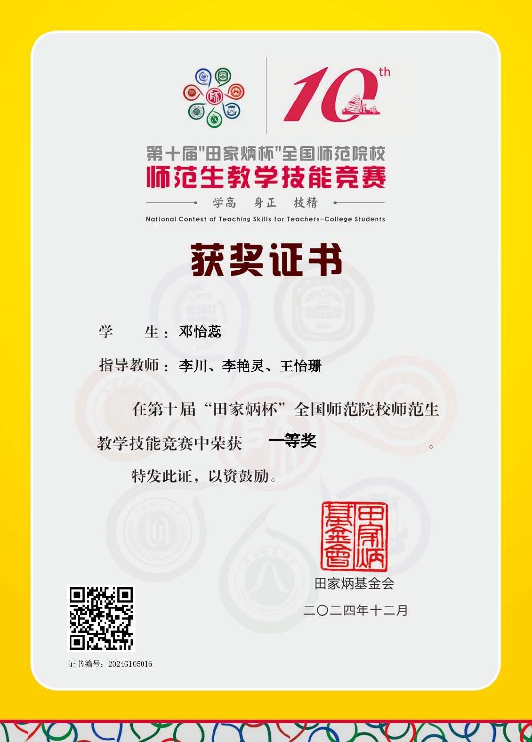 今年会官网邓怡蕊同学在第十届“田家炳杯”全国师范院校师范生教学技能竞赛中荣获一等奖